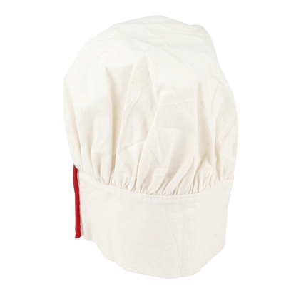 White cook's hat for small chefs, with a thin red piping, made of pure cotton and adjustable in size. Show everyone that you are a true chef in the kitchen, through your outfit and cooking skills!