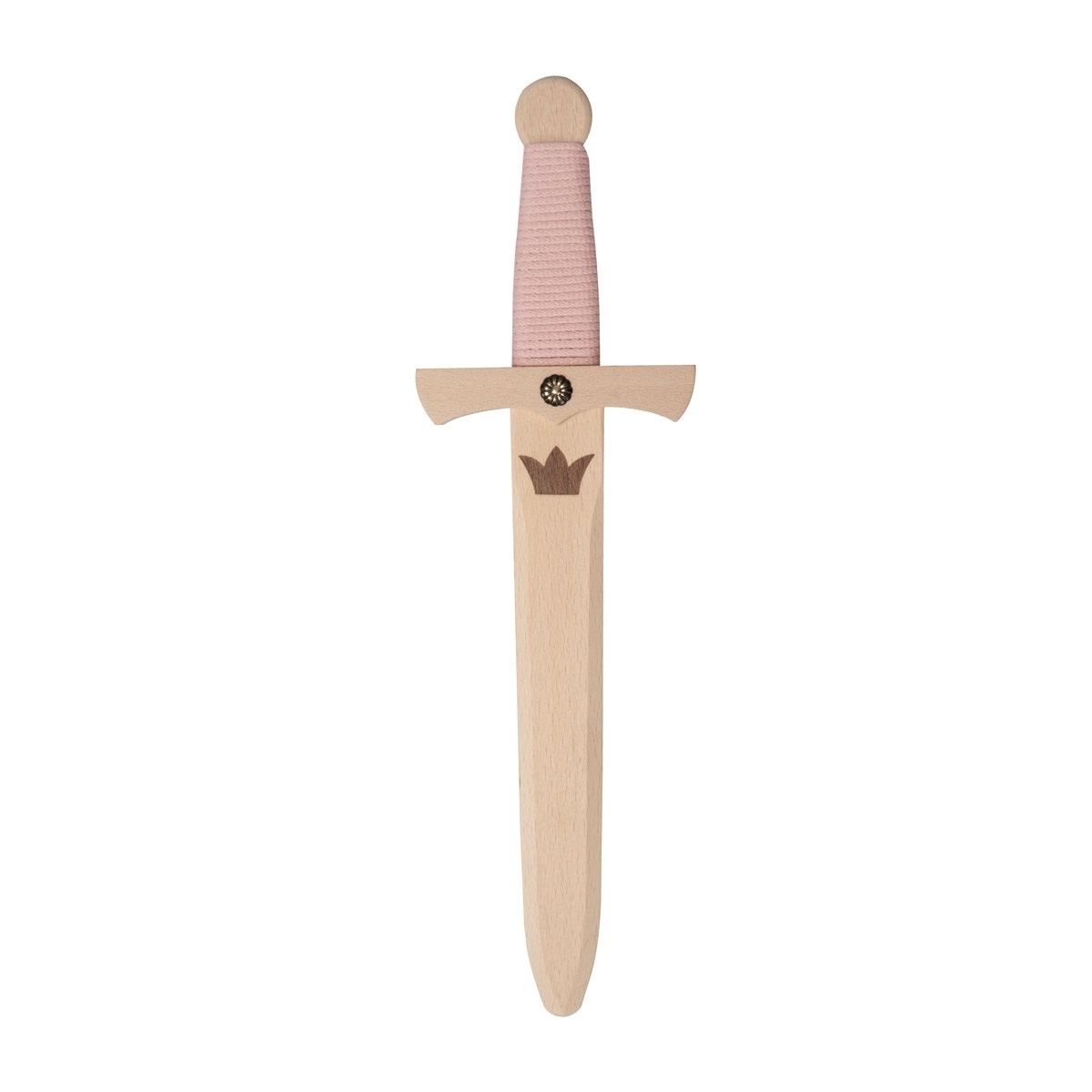 Pink princess dagger made of solid beech wood. With this wooden dagger toy, your princess has a knife to defend herself from any attack from black knights. This is an addition that makes the dress up outfit for your little princess perfect.