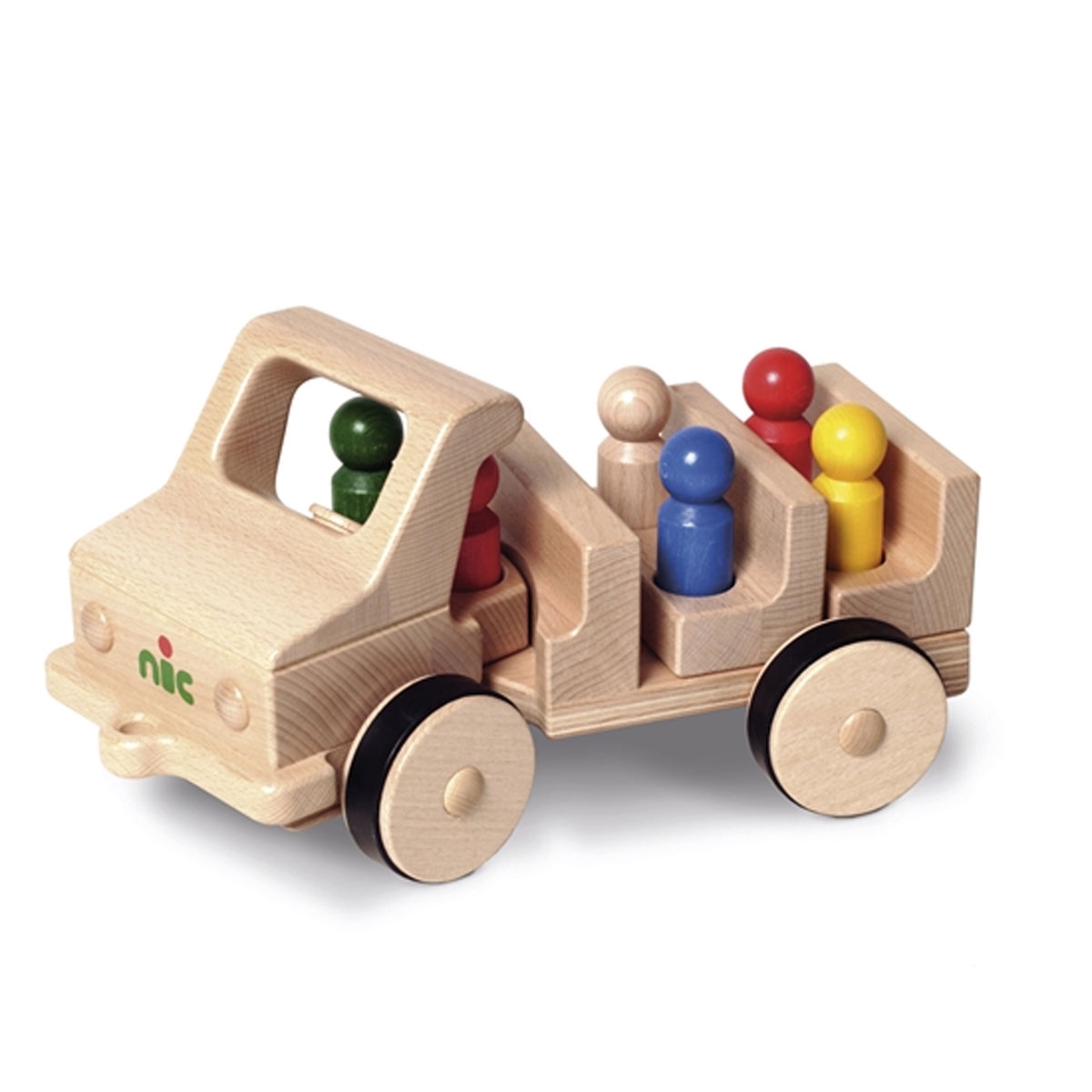 The wooden toy bus can accommodate 6 passengers, whether they be family or friends. We leave the destination of the trip to the overflowing imagination of our little ones. Easy to maneuver thanks to its integrated handle and with the open access, the wooden figures easily enter and exit this wooden bus. Part of the Nic Creamobil interchangeable vehicles, the benches can be easily removed, as well as the 6 figurines and can be widely used in free play. Due to the size of each element which prevents it from being swallowed, these wooden toy buses can be used from a very young age and interest children up to approximately 7 years old. As this series is constantly expanding, the basic model can be endlessly customised with numerous accessories available – equipments, trailers, benches and wooden figures. The basic model is 36 cm long and is carefully handcrafted from solid beech wood. The steering handle of the Creamobil basic models, proven for decades, can support even one-year-old children so that they do not tip over. With the wonderful world of Nic Creamobil, young children discover and experiment the world in playful way. The different equipment, trailer types and conversion possibilities make the stable and high-quality Creamobil vehicles made of solid beech wood real all-rounders, which can be used in a variety of ways for children's play.