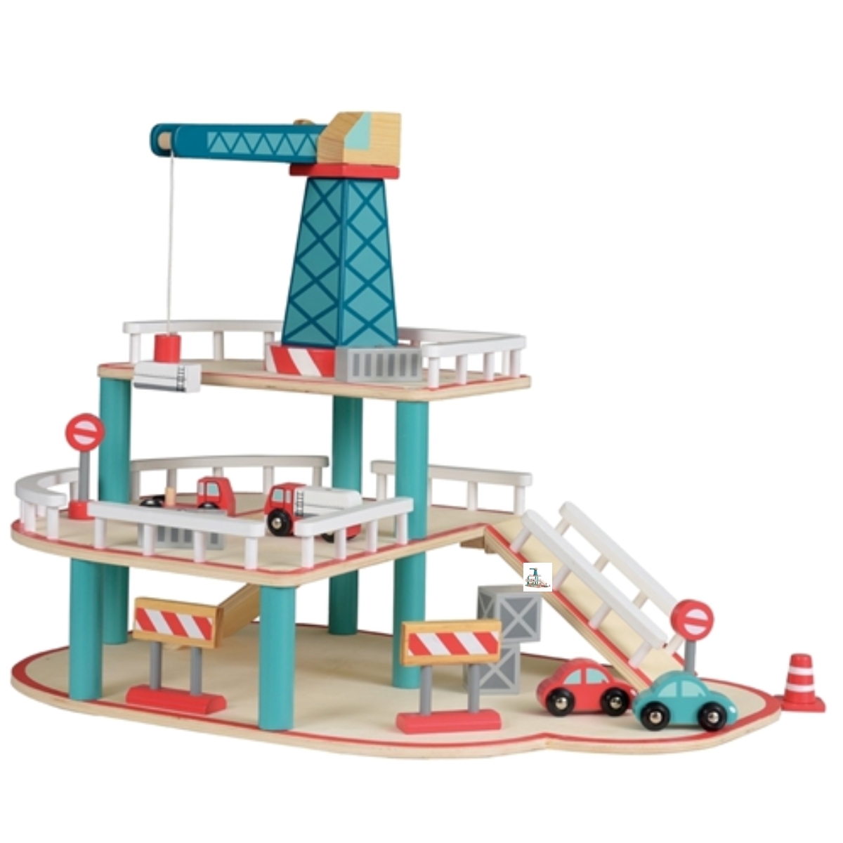 Wooden car garage, comprising 2 floors supported by blue columns. The upper floors and the access ramps have white guardrails. On the second floor is a blue crane capable of pivoting on its axis. It can also be placed elsewhere. It lifts the loads thanks to its magnet. The workshop is delivered with road signs, 2 cars, one red and one blue, 3 trucks and containers with a metal badge, enough to play with joy for hours!