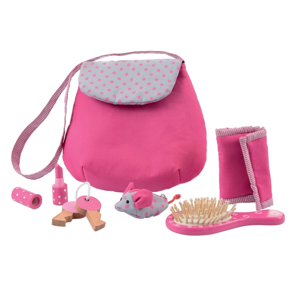 Lovely pink handbag for little girls who love elegance, with all the needs for chic ladies: a hairbrush, lipstick, money bracket, wallet and key bush.